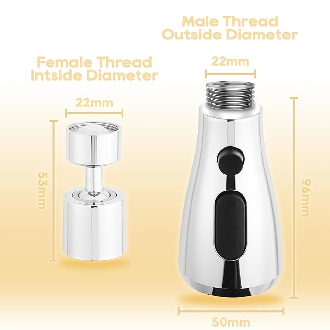 Kitchen Faucet 3-Function Pull Down Sink Sprayer Attachment for Faucet Pull Out Spray Head Head Big Angle Rotatable Anti -Splash Faucet for Kitchen Rotating Sink Faucet Aerator (1 Pc)Description-3 FUNCTIONS Kitchen faucet extender provides 3 functions; gentle water flow for daily use; medium pressure water flow for cleaning sinks; high pressure water flow is suitable for washing dishes, or rinsing stains.HIGH QUALITY MATERIALS Faucet aerator is made of high quality Brass and ABS materials, which is durable and shiny like new.SAVE WATER Rylan faucet extender save up to 70% water compared to the traditional one. Our faucet aerator has a built-in honeycomb foaming core, which mixes water well with air, making the water flow smooth, soft to the touch, and eliminating splashes. The addition of air improves the efficiency of water use, thereby saving water.DOUBLE ROTATING SHAFT This swivel faucet attachment is designed with two independent axes of rotation, allowing it to rotate 720, allowing you to easily clean any corner of the sink.GENERIC The universal faucet extender is easy to install. If the rotating shaft on the top is removed, the aerator can be connected to pull-out faucets.Dimension-Volu. Weight (Gm) - 125Product Weight (Gm) - 118Ship Weight (Gm) - 125Length (Cm) - 16Breadth (Cm) - 6Height (Cm) - 6